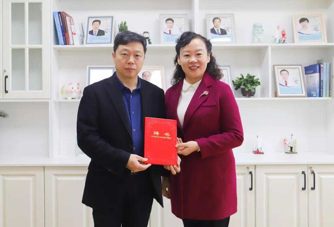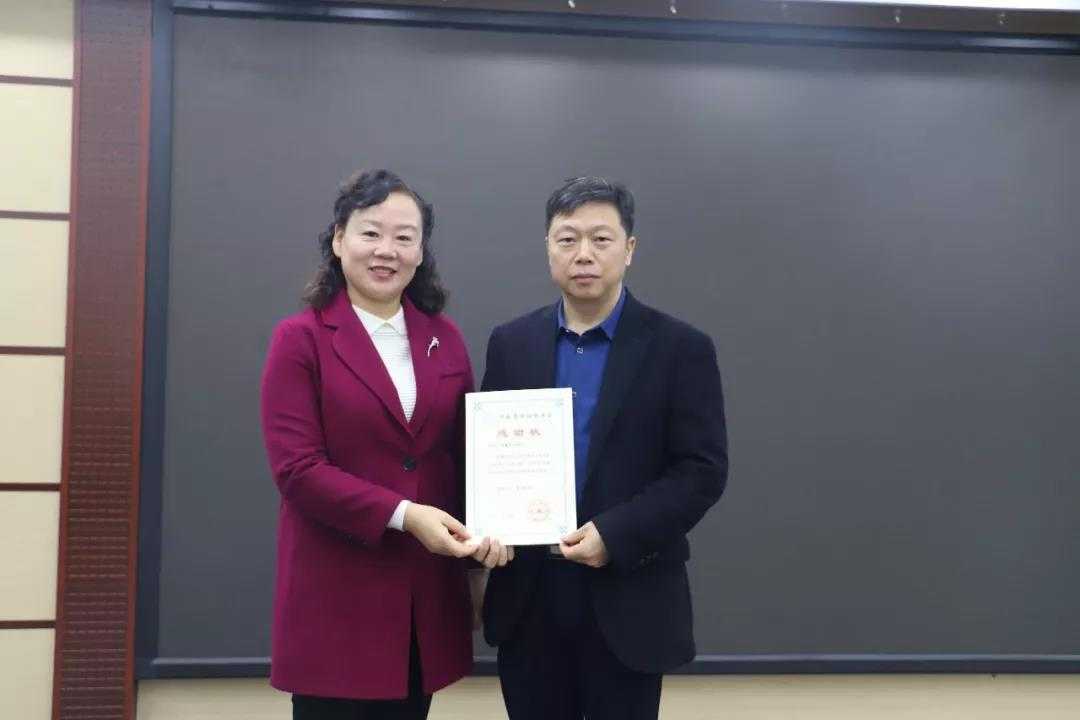 开封市口腔医院书记、院长李彩霞向吴豪阳教授颁发开封市口腔医院知名专家工作室知名专家聘书。