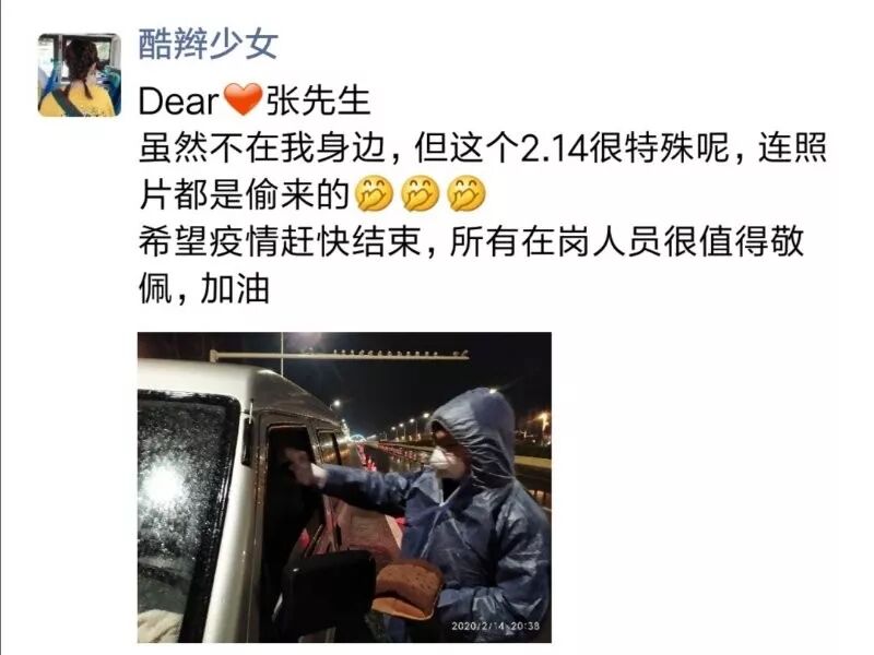 这天还是情人节,张震在风雪中值守,顾不上给女友段雪珂说一声节日快乐,同为口腔医院医生、在单位参加疫情防控值班的段雪珂在微信里只能从医院宣传中“偷”来一张照片,写道,这个2.14很特殊,希望疫情赶快结束,加油。