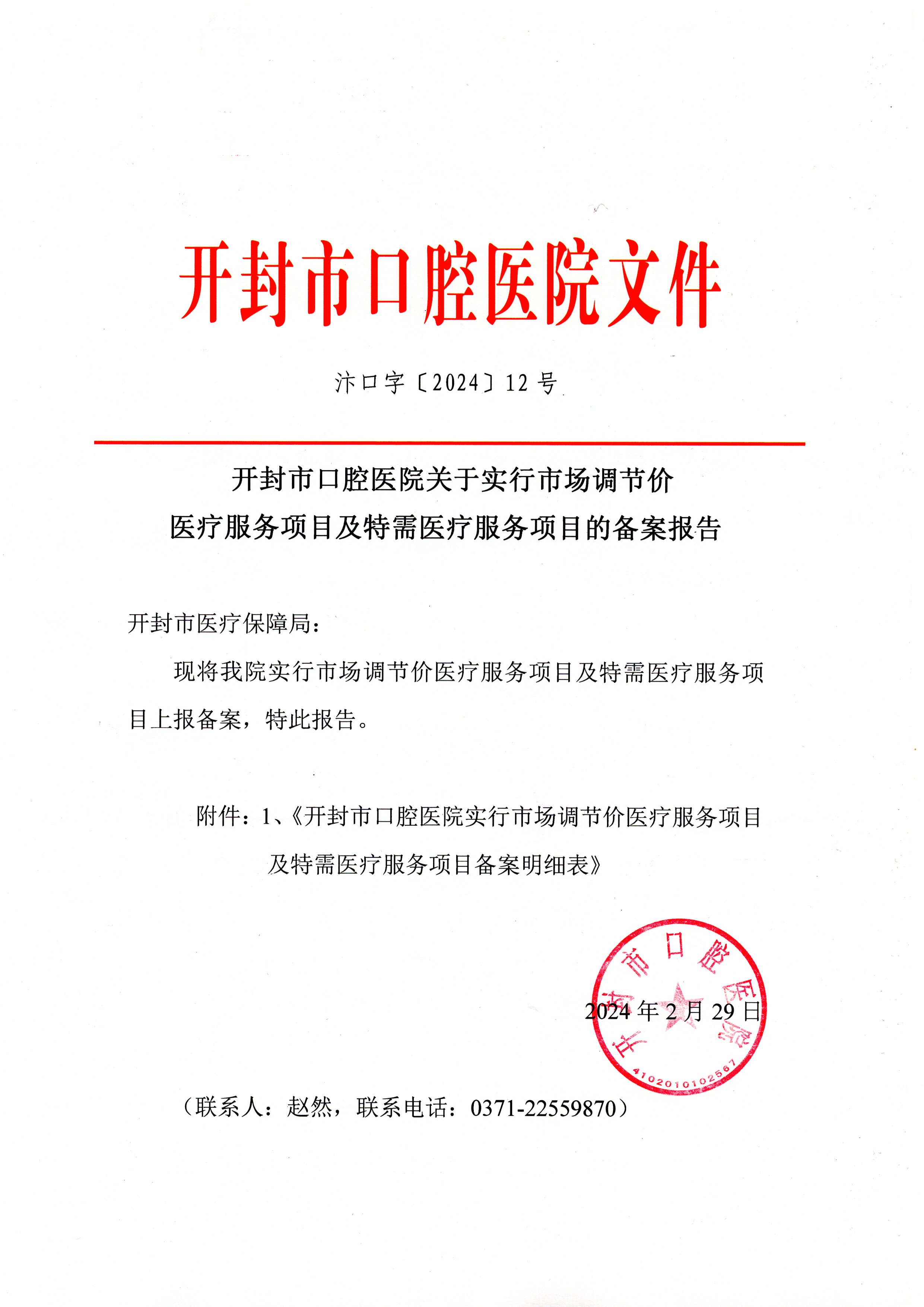 开封市口腔医院关于实行市场调节价医疗服务项目及特需医疗服务项目的备案报告