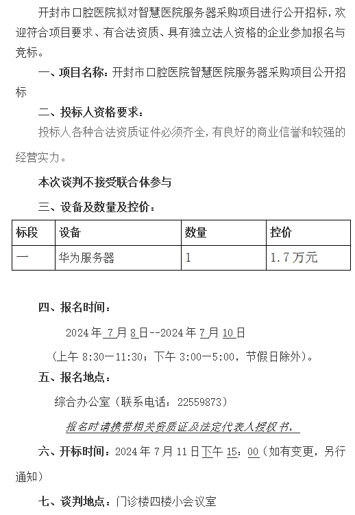 开封市口腔医院智慧医院服务器采购项目公开招标公告