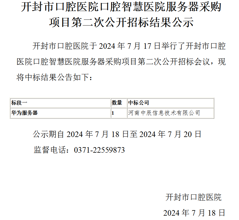 开封市口腔医院口腔智慧医院服务器采购项目第二次公开招标结果公示