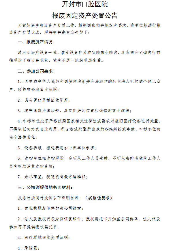 > 开封市口腔医院报废固定资产处置公告