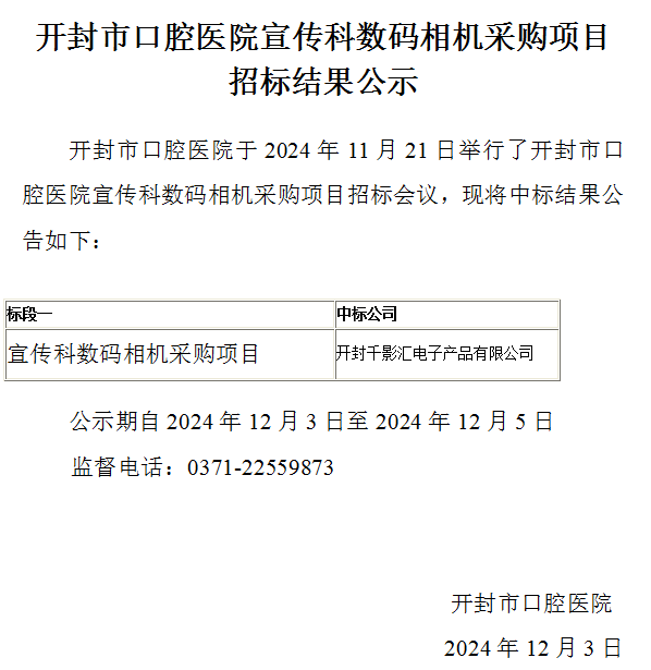 开封市口腔医院宣传科数码相机采购项目招标结果公示