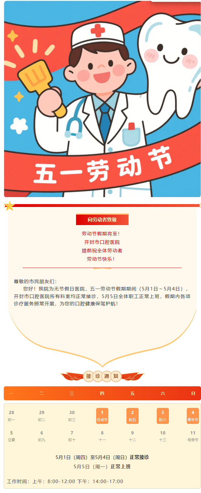 > 开封市口腔医院“五一劳动节”假期正常接诊,致敬各行各业劳动者!