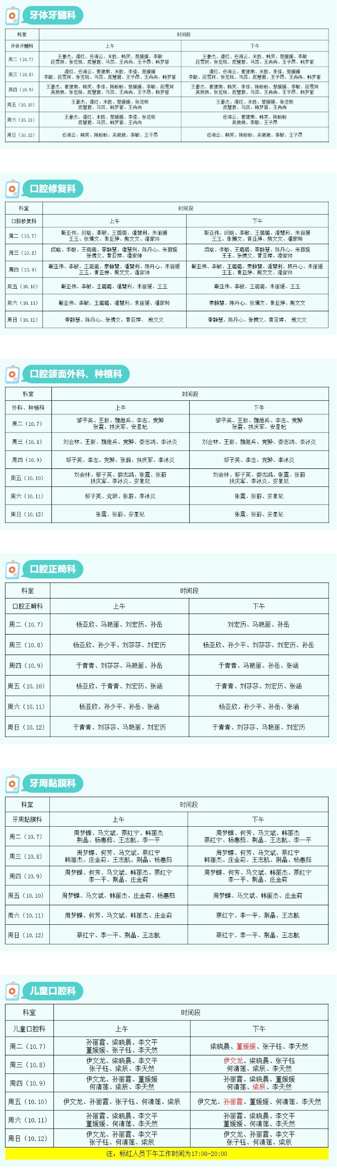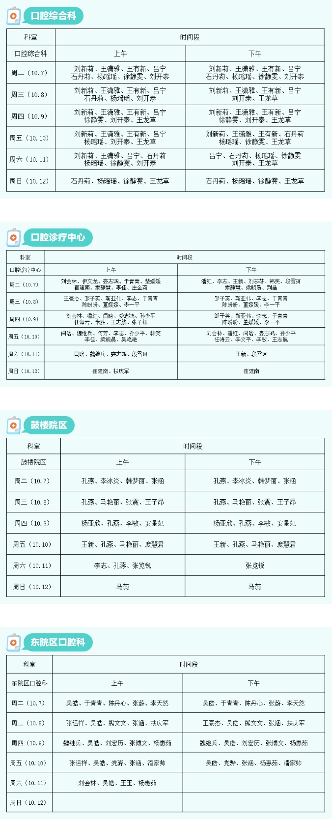 开封市口腔医院2025年10月7日至2025年10月12日各科室专家及医师坐诊表