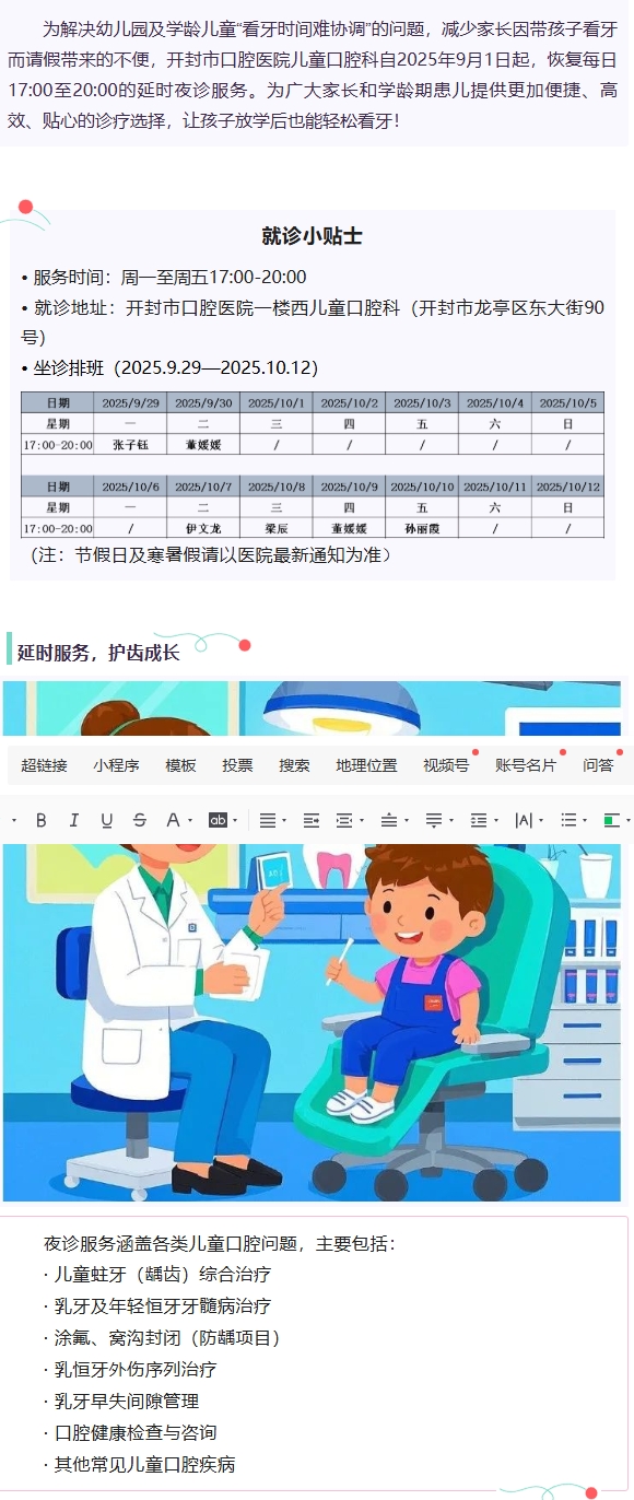 放学看牙不请假!开封市口腔医院儿童口腔科【延时夜诊】排班