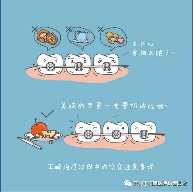 3、正畸治疗期间,一般饭菜均可食用,但不能啃食硬物及粘性食物,大块食物及较硬的水果应切成小片后食用,否则将造成矫治器松动脱落或损坏,延长治疗的疗程。